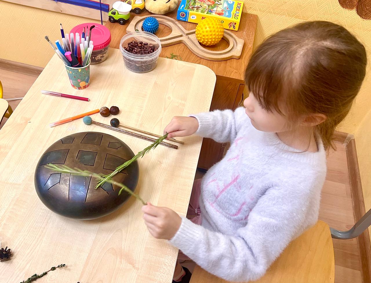Психолог детского отделения использует на занятиях по сенсорной интеграции с детьми различные музыкальные инструменты. Например-глюкофон (лепестковой барабан). Звук глюкофона мягкий, окутывающий, сказочный,  что позволяет придумывать множество интересных музыкальных игр для детей. Для разного звучания специалист использует, не только деревянные палочки, а еще веточки тимьяна и розмарина, различные сыпучие материалы, фасоль, каштан . Такие необычные музыкальные упражнения позволяют детям гармонично развивать не только слуховую сенсорику. Выстраивается целостная картина занятий, направленная на все виды восприятия: тактильное, зрительное, слуховое, вестибулярное. Это универсальная палочка-выручалочка, на любой возраст! Полезно, интересно и малышам, и школьникам.
